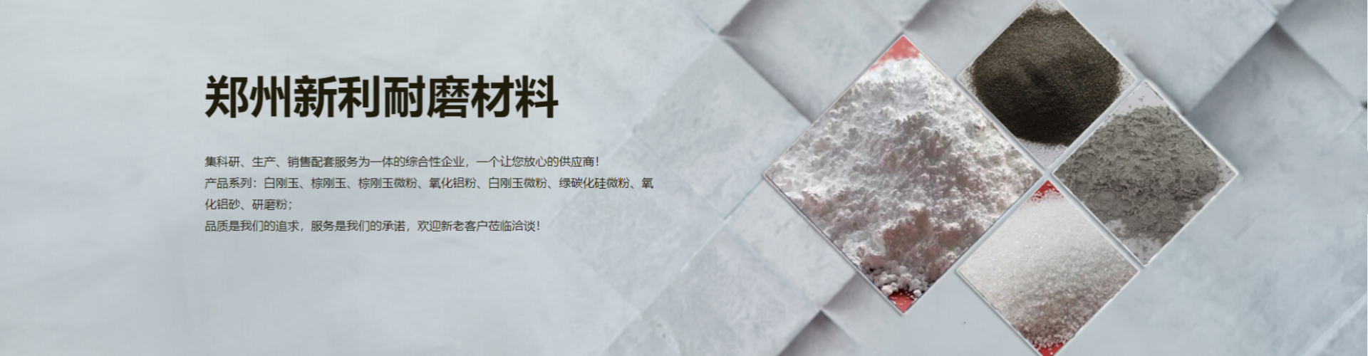 鄭州新利耐磨材料有限公司主要產(chǎn)品:包含白剛玉砂、白剛玉微粉、棕剛玉、棕剛玉微粉、 綠碳化硅微粉、氧化鋁砂、氧化鋁粉、研磨粉等多系列產(chǎn)品,為客戶提供豐富的產(chǎn)品型號及加工定制服務(wù)...